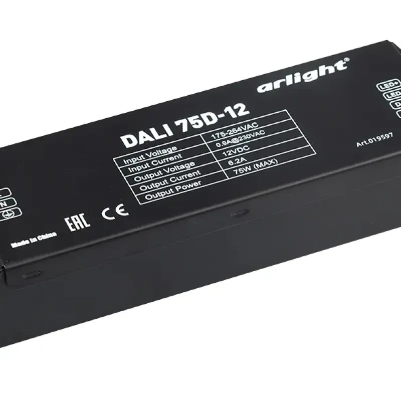 DALI диммер на 1 адрес, совмещенный с блоком пит-я, для одноцветных с/д лент, 1 канал. Функция PUSH DIMMER, работает с DALI Touch switch. "Умный дом". Пит-е AC175-264V; Выход 12VDC; Макс.ток 1х6.2A; Макс. мощность 75W; Размеры 204х54х33 мм; Вес 440г. Заменяется на 024344.