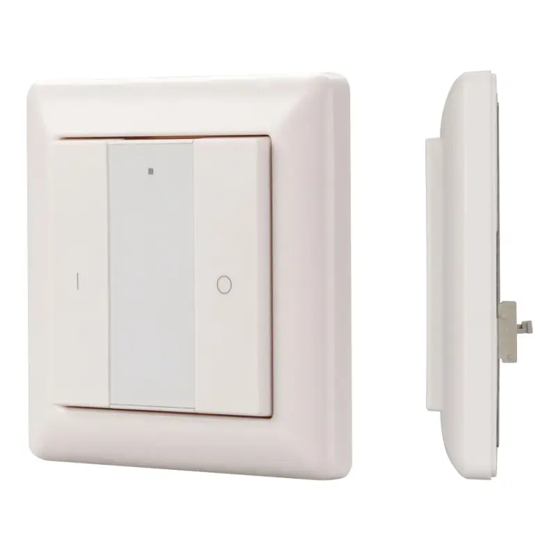 Встраиваемая пластиковая панель белого цвета с кнопочным управлением, предназначенная для управления одноцветными светодиодными лентами, светильниками и другими источниками света в системах управления светом DALI. Позволяет включать/выключать свет и менять его яркость в 1 группе либо в режиме широковещателя (Broadcast). Установка номера группы и сцен выполняется переключателями на задней стороне панели. Устройство совместимо с диммерами стандарта DALI. Передача команд от панели к диммерам выполняется по общей двухпроводной шине DALI. Удобное и точное управление при помощи отдельных механических кнопок для каждой функции. Питание от шины DALI. Габариты устройства составляют 81х81х22.5 мм. Панель совместима с декоративными рамками ведущих мировых производителей (GIRA, JUNG, BERKER, MERTEN). Стандартная рамка входит в комплект поставки.