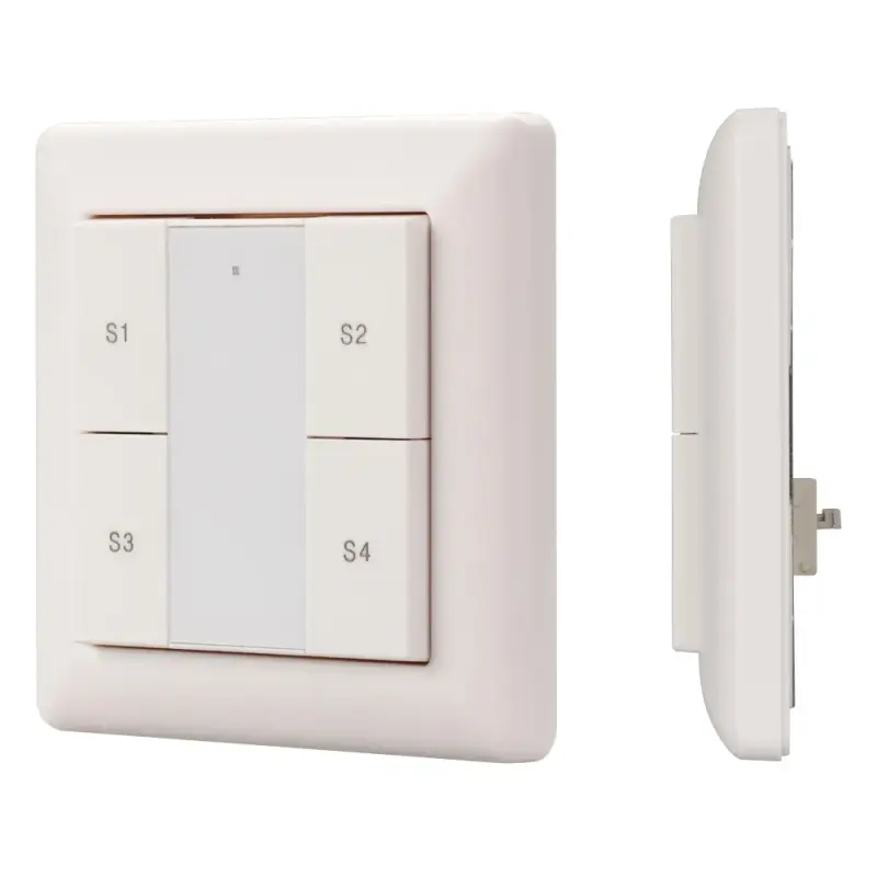 Встраиваемая пластиковая панель белого цвета с кнопочным управлением, предназначенная для включения и выключения световых сцен в системах управления светом DALI. Позволяет включать/выключать световые сцены в одной группе или для всех подключенных исполнительных устройств (Broadcast). Установка номера группы и сцен выполняется переключателями на задней стороне панели. Поддерживает управление 4 сценами. Устройство совместимо с диммерами стандарта DALI. Передача команд от панели к диммерам выполняется по общей двухпроводной шине DALI. Удобное и точное управление при помощи отдельных механических кнопок для каждой функции. Питание от шины DALI. Габариты устройства составляют 81х81х22.5 мм, установка в стандартную монтажную коробку. Панель совместима с декоративными рамками ведущих мировых производителей (GIRA, JUNG, BERKER, MERTEN). Стандартная рамка входит в комплект поставки.