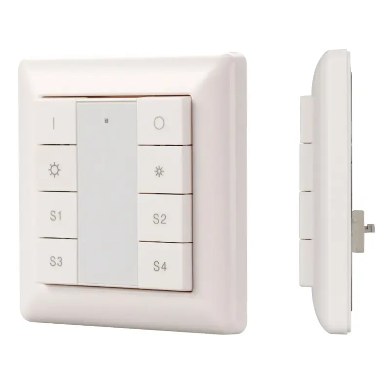 Встраиваемая пластиковая панель белого цвета с кнопочным управлением, предназначенная для управления одноцветными светодиодными лентами, светильниками и другими источниками света в системах управления светом DALI. Позволяет включать/выключать свет в одной группе, менять его яркость, сохранять и вызывать до 4 световых сцен. Установка номера группы и сцен выполняется переключателями на задней стороне панели. Устройство совместимо с диммерами стандарта DALI. Передача команд от панели к диммерам выполняется по общей двухпроводной шине DALI. Удобное и точное управление при помощи отдельных механических кнопок для каждой функции. Питание от шины DALI. Габариты устройства составляют 81х81х22.5 мм. Панель совместима с декоративными рамками ведущих мировых производителей (GIRA, JUNG, BERKER, MERTEN). Стандартная рамка входит в комплект поставки.