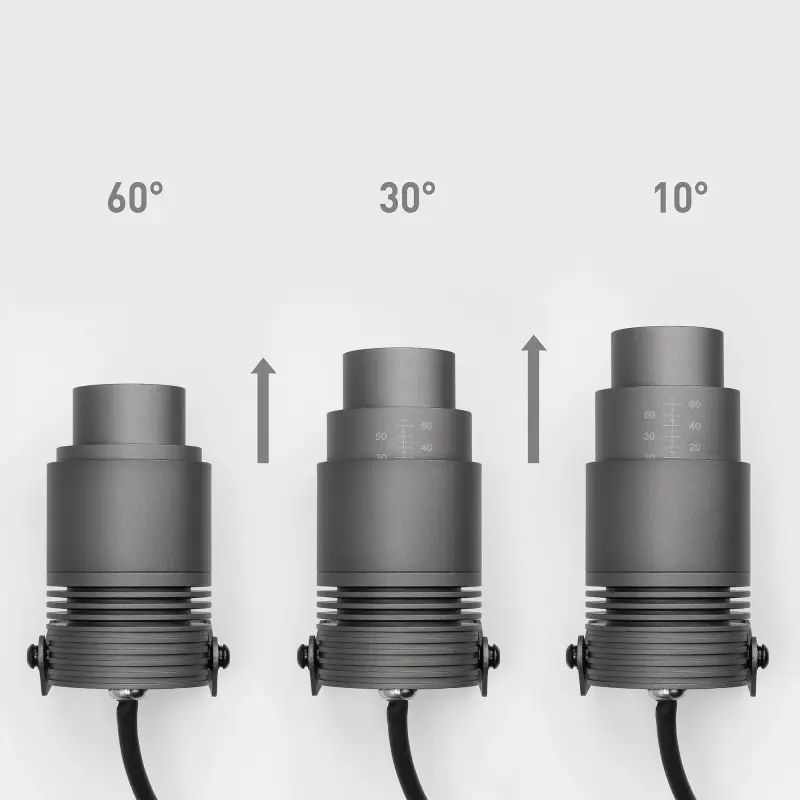 Уличный светодиодный прожектор RAY-ZOOM мощностью 12 Вт предназначен для организации локального освещения элементов фасадов зданий и сооружений, малых архитектурных форм, деревьев и зеленых насаждений. Поворотная конструкция корпуса позволяет мгновенно регулировать направление света в вертикальной плоскости. Изменяемый угол излучения дает возможность решать задачу точечного освещения объектов. Ударопрочный корпус выполнен из алюминия с устойчивым анодно-оксидным покрытием. Оптический блок закрыт прочным экраном из закаленного стекла толщиной 3мм. Степень пылевлагозащиты светильника IP67 рассчитана на длительное использование на открытом воздухе, обеспечивая надежную работу в неблагоприятных условиях. Встроенный драйвер позволяет безопасно и быстро подключить светильник к сети 230В, а для удобства монтажа в комплект входит провод длиной 1м. Возможна установка в грунт или на поверхность при помощи основания-пики или круглого основания (приобретаются отдельно).