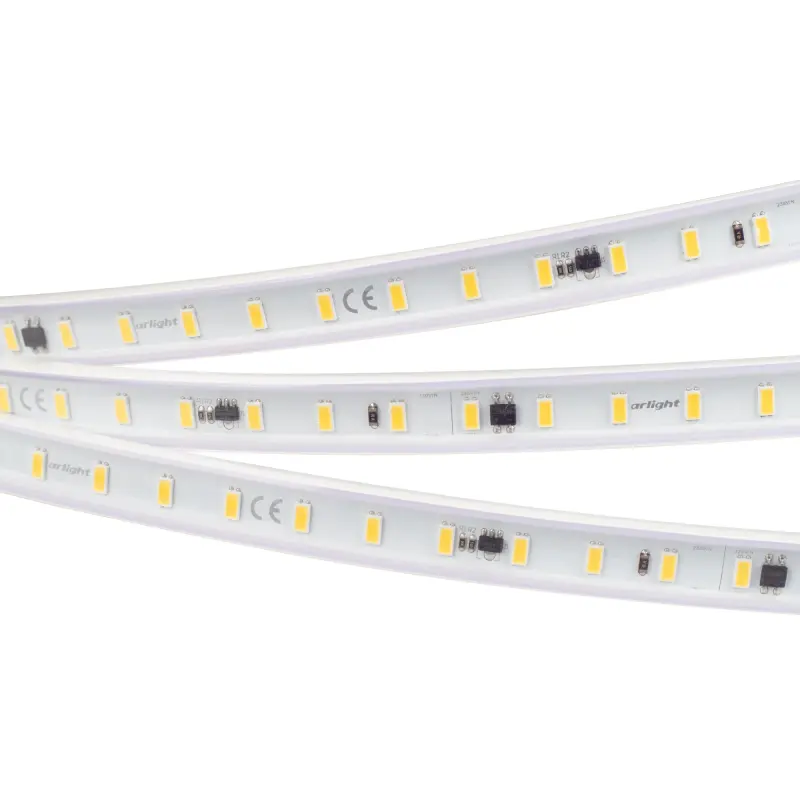 Герметичная лента ARL серии C72, IP65(PV-трубка ПВХ экструзия) оболочка ленты имеет защиту от УФ излучения, что позволяет использовать ее на улице. Лента подключается непосредственно к сети переменного тока 230 В и не требует использования источников питания. Использование интегральных стабилизаторов тока позволяет подключать ленту длиной до 50м, обеспечивая при этом равномерную яркость свечения по всей длине ленты. При подключении нескольких лент, подавать питание на каждые 50м отдельным кабелем. Запрещается последовательное подключение лент более 50м. Лента применяется для подсветки потолочных ниш, декоративной подсветки, создания контуров рекламных объектов. Может использоваться в помещениях и на улице. На лентах установлены микросхемы с функцией снижения тока для защиты ленты от перегрева, что обеспечивает надежную работу лент в различных условиях. Диммирование осуществляется диммерами TRIAC в диапазоне 15%-90%. Крепление с помощью скоб, аксессуары для монтажа и подключения поставляются отдельно.