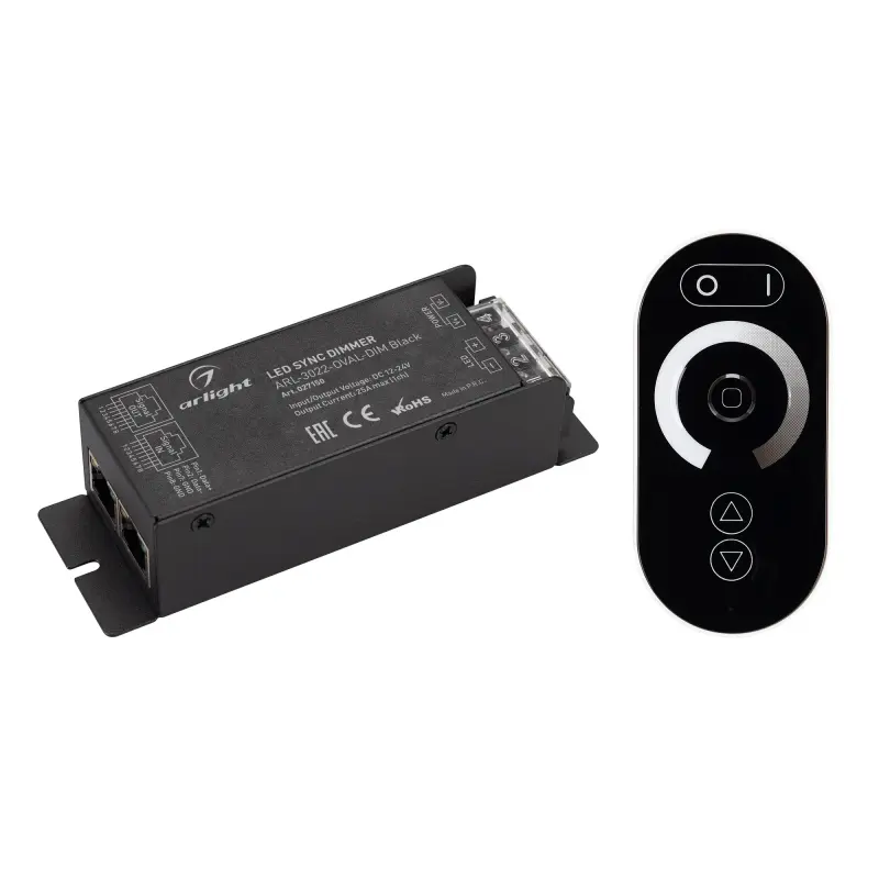 Комплект: мощный 1-канальный диммер с радиопультом черного цвета с сенсорным кольцом, для управления одноцветной светодиодной лентой. Этот комплект устройств позволит легко и удобно регулировать яркость освещения и осуществлять включение и выключение света. Питание диммера имеет диапазон напряжений от 12В до 24В, максимальный ток 25А на 1 канал, максимальная мощность 300-600Вт (в зависимости от напряжения питания). Диммер имеет порты RJ45 для возможности проводного соединения устройств между собой и синхронизации их работы. При потере питания диммера последнее состояние яркости сохраняется. Питание пульта осуществляется от 3-х батареек ААА. Габариты диммера составляют 127х41х32мм, габариты пульта составляют 114х56х23мм.