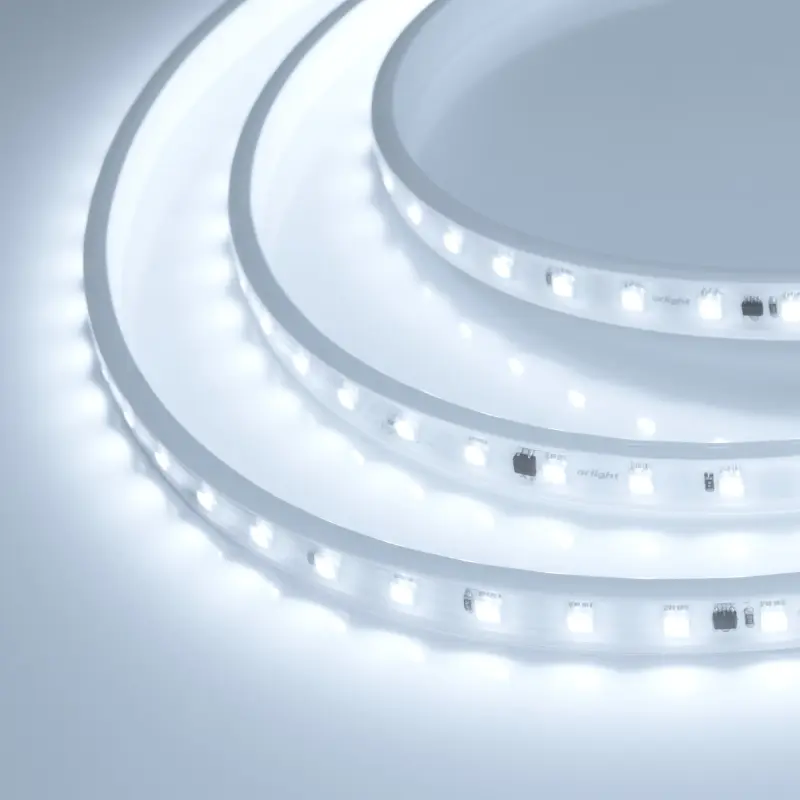 Светодиодная герметичная лента ARL серии B54 шириной 15.5 мм, мощностью 8 Вт/м, степень защиты IP65, в прозрачной ПВХ-трубке, оболочка ленты имеет защиту от УФ излучения, что позволяет использовать ее на улице. Светодиоды SMD 5060, 54 шт/м, белого цвета свечения (6000K). Высокий индекс цветопередачи CRI>90 обеспечивает точное восприятие цветовых оттенков. Лента подключается напрямую к сети переменного тока 230 В и не требует использования источников питания. Использование интегральных стабилизаторов тока позволяет подключать ленту длиной до 10м, обеспечивая при этом равномерную яркость свечения по всей длине ленты. При подключении нескольких лент, подавать питание на каждые 10м отдельным кабелем. Запрещается последовательное подключение лент более 10м. Предназначена для декоративной подсветки на улице и в помещениях, создания контуров рекламных объектов, подсветки потолочных ниш. На лентах установлены микросхемы с функцией снижения тока для защиты ленты от перегрева, что обеспечивает надежную работу лент в различных условиях. Диммирование осуществляется диммерами TRIAC в диапазоне 15%-90%. Крепление с помощью скоб, аксессуары для монтажа и подключения поставляются отдельно. Катушка 10 м.