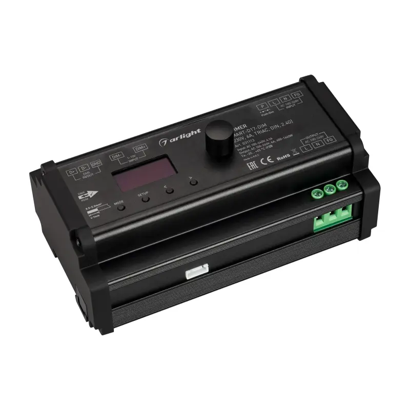 Диммер, предназначенный для включения/выключения и управления яркостью источников света с напряжением питания 230В, таких как: светодиодных диммируемых ламп, светодиодных светильников, ламп накаливания и галогенных ламп. 4 режима работы: ручной (при помощи элементов управления на корпусе), DMX512, 0-10В и 2.4G. Протокол управления DMX512 с поддержкой RDM. Диммирование выполняется отсечкой фазы сетевого напряжения 230В, с управлением по переднему/заднему фронту. Возможна установка мин. яркости 5-40%, управление внешними диммерами 0-10В и 1-10В. Устройство совместимо с радиочастотными пультами управления и настенными панелями управления серии SMART. Возможна привязка до 10 пультов или панелей управления. Питание от 230В, 1 канал управления, максимальная нагрузка 6А на канал, выходная мощность 1440 Вт для резистивной нагрузки ламп накаливания, 720 В*А для светодиодных источников света. Габариты: 168х93.5х63 мм. Пластиковый корпус черного цвета c LED монитором. Установка на DIN рейку.