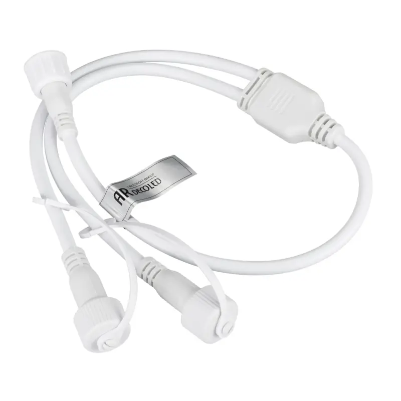 Коннектор питания (PLC сплиттер) разработан специально для подключения гирлянд серии RGB-SYNC. Оболочка из белого ПВХ придает ему элегантный внешний вид. Входное напряжение составляет 230V DC. Коннектор обеспечивает питание и сигнал на входе и выходе. Он имеет 2 выходных порта, каждый из которых поддерживает управление до 3000 RGB светодиодов. Общая поддержка управления составляет до 1500 светодиодов.