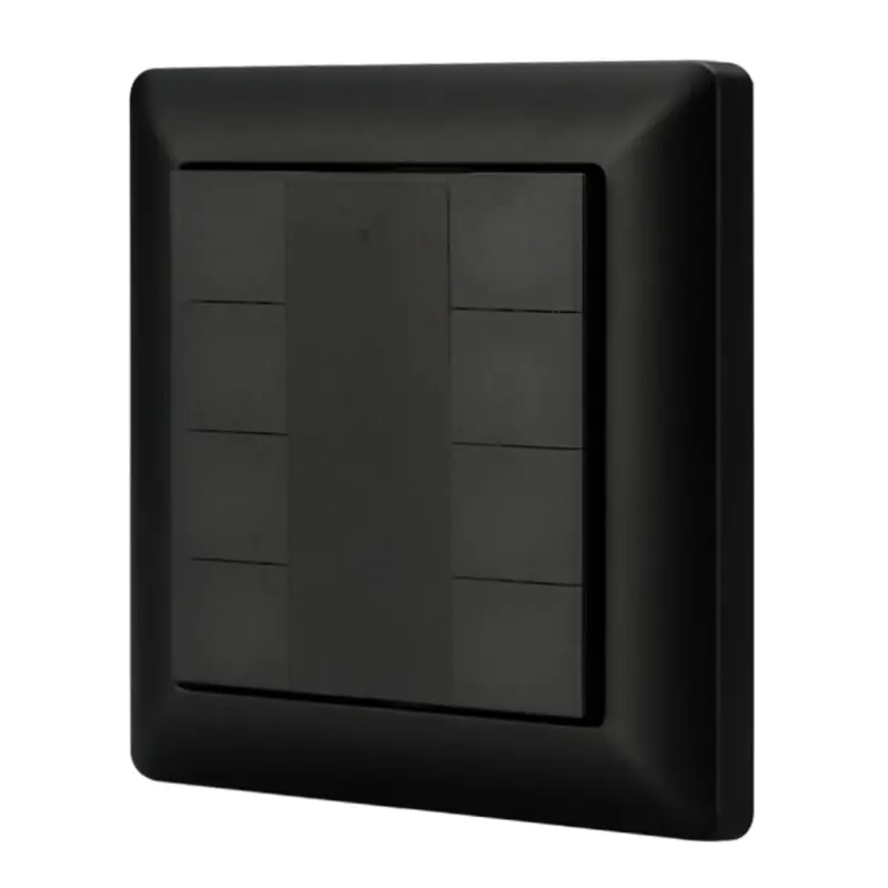 Встраиваемая пластиковая панель чёрного цвета с кнопочным управлением, предназначенная для работы с контроллерами в системах управления светом DALI-2. Напрямую не управляет исполнительными устройствами. Все команды от панели обрабатываются только мастер-контроллерами DALI. Позволяет программировать 8 кнопок и 16 светодиодных индикатора статусов. Удобное и точное управление при помощи отдельных механических кнопок для каждой функции. Питание от шины DALI. Габариты устройства составляют 81х81х22.5 мм. Панель совместима с декоративными рамками ведущих мировых производителей (GIRA, JUNG, BERKER, MERTEN). Стандартная рамка входит в комплект поставки.