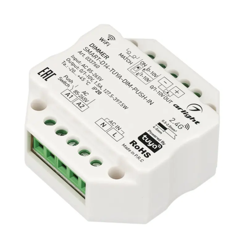 Диммер SMART-D14-TUYA-DIM-PUSH-IN (230V, 1.5A, 0/1-10V, 2.4G) (Arlight, IP20 Пластик, 5 лет)