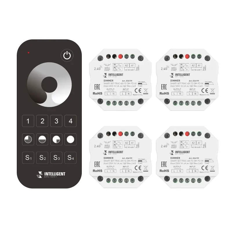 INTELLIGENT ARLIGHT Диммер SMART-SET-TRIAC-601-72-DIM-PD-IN Black (230V, 1x1.5A, x4, ПДУ 10кн, 2.4G) (IARL, IP20 Пластик, 5 лет)