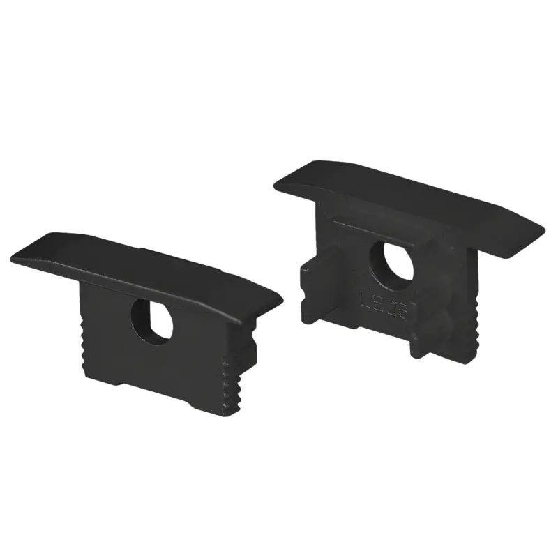 Черные заглушки (2 шт.) с отверстием для профиля SL-SLIM-H13M-F25. Придают законченный вид светильнику, а также защищают светодиодную ленту от внешних факторов (грязи, пыли и прочего). Отверстие в заглушке позволяет вывести кабель питания светодиодной ленты.