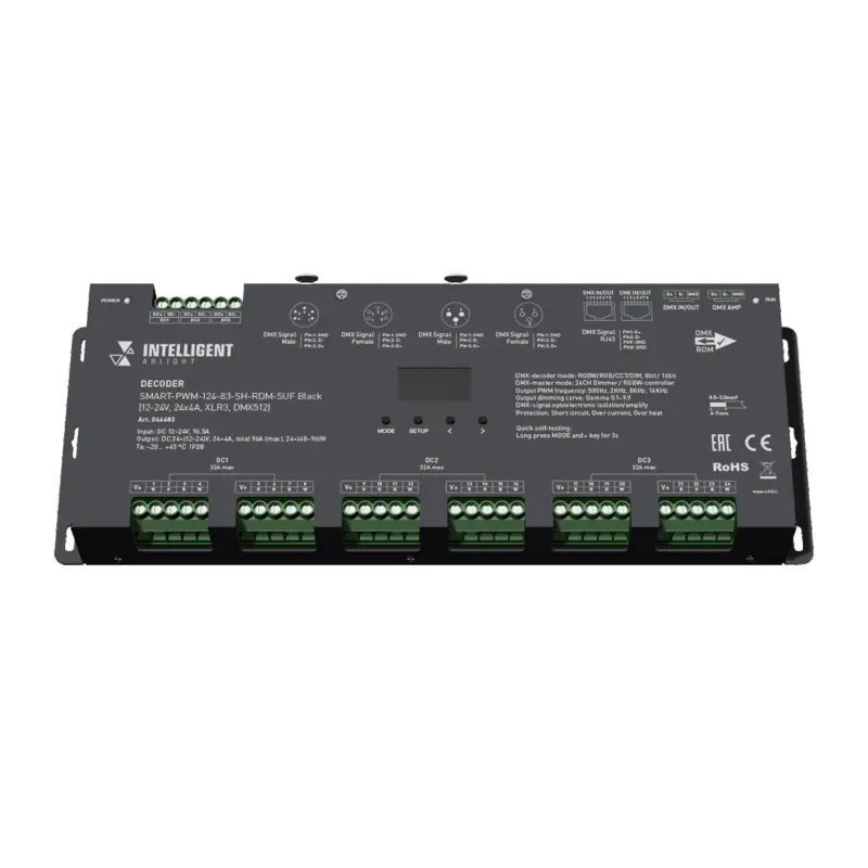 Декодер (преобразователь) цифрового сигнала DMX512 в ШИМ для управления светодиодными лентами DIM/MIX/RGB/RGBW. Декодер выполняет функции: регулировка яркости, включение и выключение света, управление цветом. Декодер совместим с панелями управления контроллерами с выходом DMX512. Также, управление декодером осуществляется кнопками на корпусе, информация о режиме отображается на цифровом дисплее. Устройство имеет настраиваемую частоту ШИМ в диапазоне от 500Гц до 1600Гц, и настройку кривой диммирования, может выступать в качестве мастер-контроллера DMX512 с функцией RDM, поддерживает трансляцию встроенных динамических программ посредством протокола DMX512 (10 встроенных программ с настройкой скорости яркости и цвета), подключается с помощью разъемов RJ-45, XLR3 и XLR5. Напряжение питания составляет 12-24В, максимальный ток 4А на канал, всего 24 канала, максимальная мощность 1152-2304Вт (в зависимости от напряжения питания). Габариты декодера составляют 324x116x38.5 мм, материал корпуса - металл.