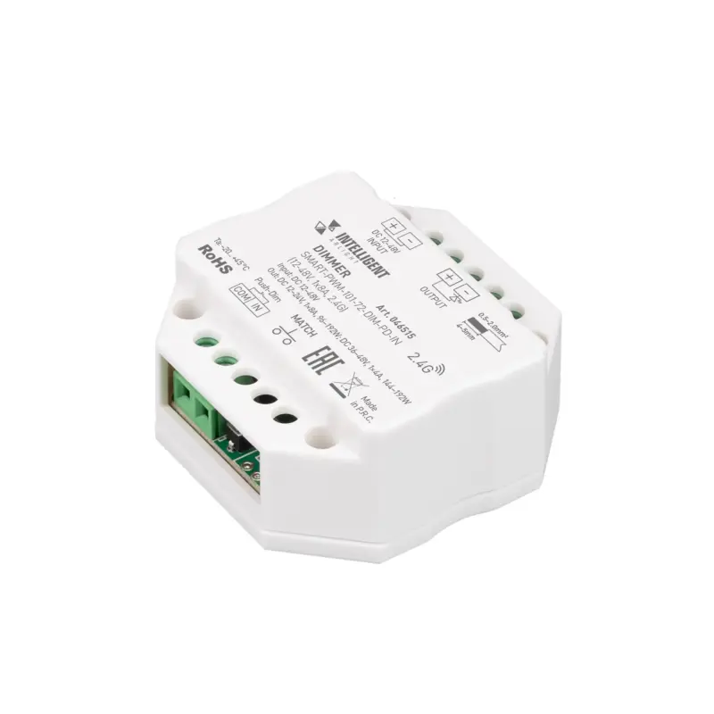 Диммер для управления одноцветной светодиодной лентой по ШИМ и другими светодиодными источниками света с напряжением питания 12-48В. Выполняет основные фукнции: включение/выключение, регулировка яркости. Реализована фукнция Push-Dim - управление с помощью выключателя возвратного типа с нормально разомкнутыми контактами. Устройство совместимо с радиочастотными пультами дистанционного управления и настенными панелями управления серии SMART. Возможна привязка до 10 пультов или панелей управления. Питание от 12-48В, максимальная нагрузка 8A на канал при напряжении (DC12-24V) и 4А на канал при напряжении (DC36-48V), выходная мощность для 12-24В - 96-192Вт, для 36-48В - 144-192Вт (в зависимости от напряжения питания). Габариты устройства 52х52х26 мм, встраивается в стандартную монтажную коробку.