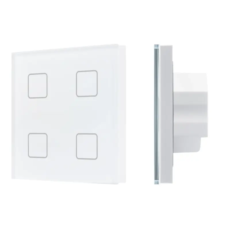 Встраиваемая стеклянная панель белого цвета с сенсорным управлением, предназначенная для управления светодиодным или любым другим освещением в системах управления светом DALI. Позволяет включать/выключать свет и менять его яркость по 4 адресам. Установка адреса выполняется переключателями на задней стороне корпуса панели. Устройство совместимо с диммерами стандарта DALI. Передача команд от панели к диммерам выполняется по общей двухпроводной шине DALI. Удобное и точное управление при помощи отдельных сенсорных с подсветкой синего цвета. Наличие датчика приближения и звукового сигнала срабатывания (можно отключить). Питание от шины DALI. Габариты устройства составляют 86x86x34.5 мм, установка в стандартную монтажную коробку.