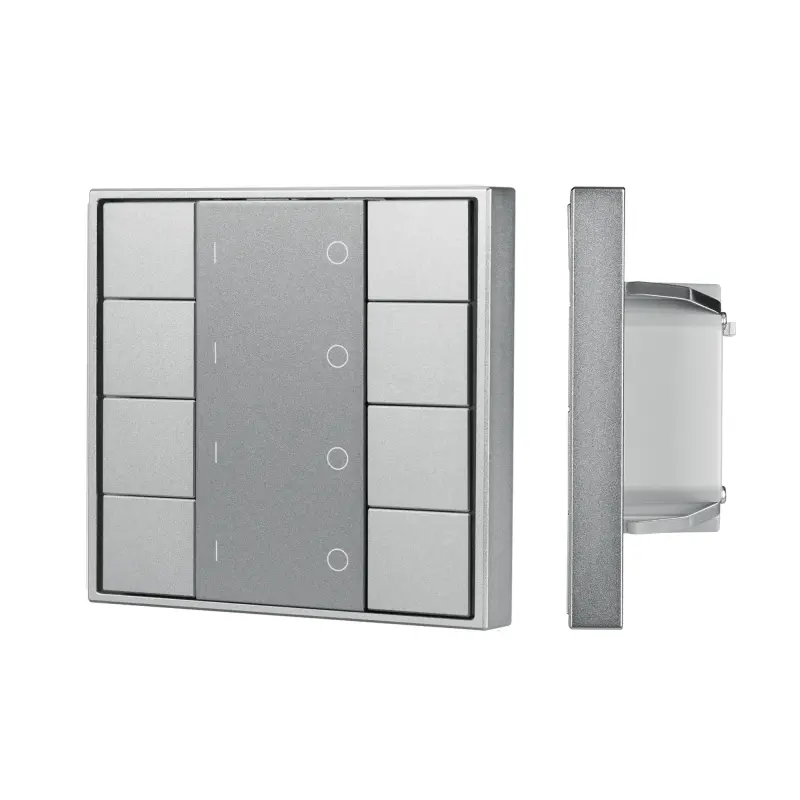 Встраиваемая металлическая панель серого цвета с кнопочным управлением, предназначенная для управления одноцветными светодиодными лентами, светильниками и другими источниками света в системах управления светом DALI. Позволяет включать/выключать свет и менять его яркость в 4 группах либо в режиме широковещателя (Broadcast). Установка номера группы и сцен выполняется переключателями на задней стороне панели. Устройство совместимо с диммерами стандарта DALI. Передача команд от панели к диммерам выполняется по общей двухпроводной шине DALI. Удобное и точное управление при помощи отдельных механических кнопок для каждой функции. Питание от шины DALI. Габариты устройства составляют 80х80х26.6 мм.