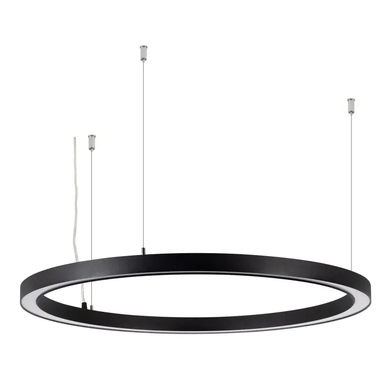 Подвесной светильник КОЛЬЦО серии SP, произведен из цельного высококачественного алюминия, без видимых стыков. Окрашен порошковой краской в RAL9005. Диаметр 900мм, сечение - 35x35 мм. Крепление светильника производится с помощью трех регулируемых тросов. В комплекте 1 выносной блок питания и кабель, подвесы. Поставляется в готовом виде и не требует дополнительной сборки.