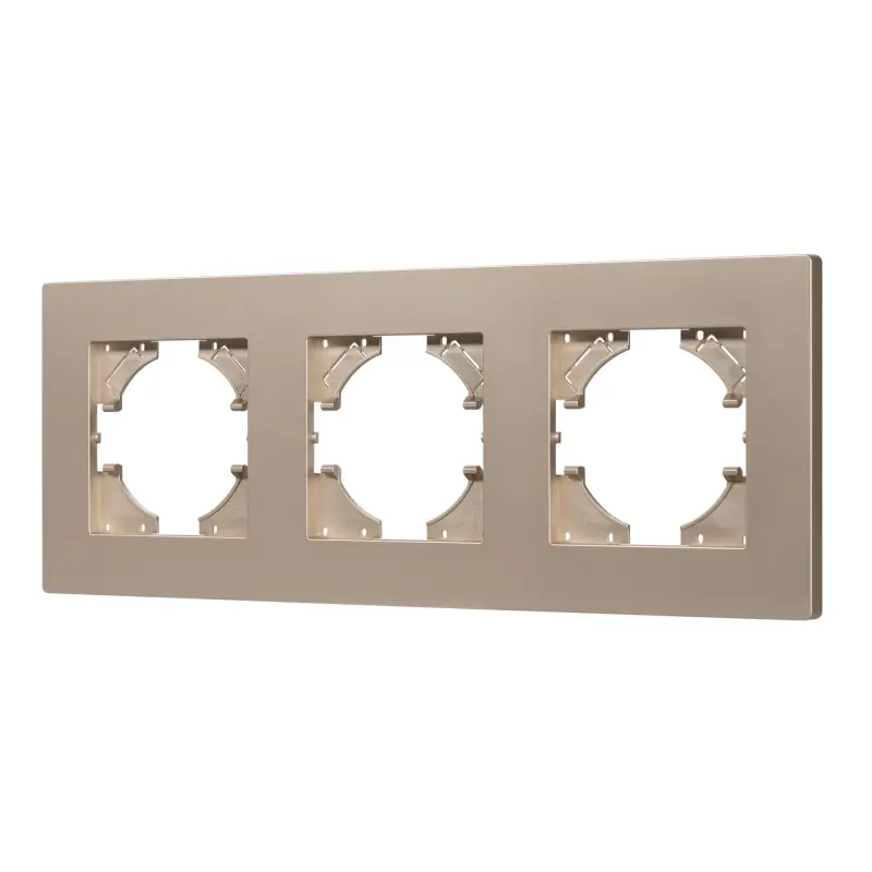 Рамка из серии PERIO изготовлена из высококачественного пластика. Корпус выполнен в золотом цвете и матированным покрытием с высотой 7мм, что позволяет гармонично встроить в интерьер любого современного дизайн-проекта. Предназначена под встраиваемые механизмы.