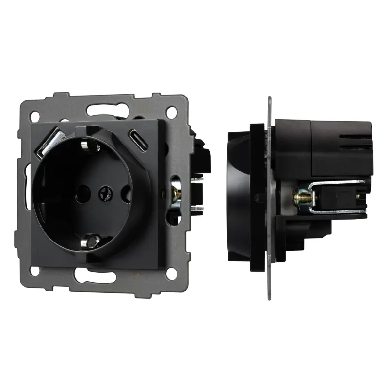 Механизм розетки с заземлением совместим с рамками серий OMALI/AKYRI/PERIO/XSILO. Скрытый тип монтажа позволяет гармонично встроить в интерьер любого современного дизайн-проекта. Видимая часть механизма выполнена из высококачественного пластика черного цвета. Контактная часть присоединяется при помощи винтовых зажимов, а усиленные распорные лапки надежно фиксируют механизм в установочном подрозетнике. Дополнительно встроены два зарядных порта USB Type A + Type C. Зарядный порт USB Type C с поддержкой протокола быстрой зарядки Quick Charge 3 (совместимо с протоколами Adaptive Fast Charging (Samsung); Huawei Super Charge; Power Delivery (Apple)).
