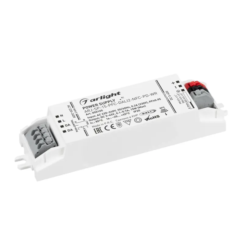 Блок питания ARJ-SP-15-PFC-DALI2-NFC-PD-WR (15W, 3-45V, 0.1-0.7A) (Arlight, IP20 Пластик, 5 лет)