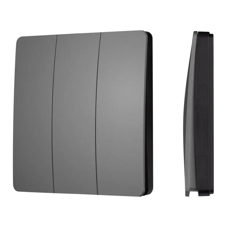 Накладная кнопочная панель серого цвета, изготовленная из пластика. Предназначена для управления одноцветными источниками света (ШИМ) с помощью кнопок. Основные выполняемые функции: включение и выключение света, регулировка яркости. Удобное и точное управление с помощью эргономичных кнопок. Изделие применяется в качестве пульта дистанционного управления диммерами и релейными модулями серий TUYA-***-WF и TY-***-WF, поддерживающими управление по радиоканалу 433MHz. Не требует питания, имеет встроенный кинетический источник питания. Габариты панели 86х86х16.5 мм, корпус выполнен из пластика. Устройство устанавливается на любую поверхность, к которой возможно прикрутить монтажную базу панели.