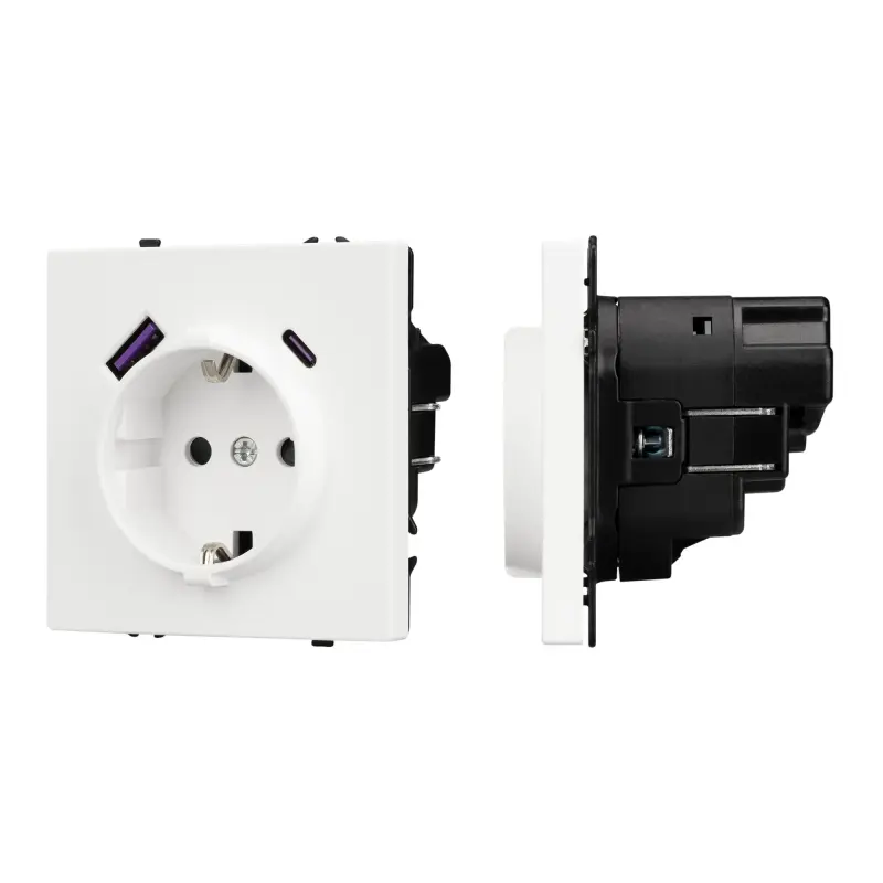 Механизм розетки с USB зарядкой, совместимый с рамками серии NOBE, создает утонченный минималистичный вид. Наличие USB Type A и Type C портов позволяет существенно сократить количество используемых розеточных постов под евровилку, сохраняя единую стилистику интерьера всего современного дизайн-проекта. Оба разъема поддерживают протокол быстрой зарядки Quick Charge QC 3.0, помимо этого для разъема Type C доступен протокол Power Delivery*.