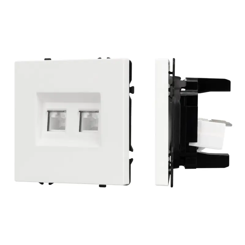 Выходной порт RJ-45 (Female) формата 8P8C соответствует категории 6 (Cat.6), что поддерживает высокоскоростные соединения до 10 Гбит/с на расстоянии до 55 метров. Самозакрывающаяся крышка защищает выходной порт от повреждения и загрязнения внешних контактов разъема. Контактная часть выполнена по технологии IPC (изоляционно–пробивающего контакта) с нанесением цветной маркировки схемы разводки на корпус, позволяя быстро и легко подсоединить механизм компьютерной розетки к большинству многожильных кабелей типа UTP (неэкранированные). А усиленные распорные лапки двойного захвата надежно фиксируют механизм в установочном подрозетнике круглого сечения диаметром 60мм.