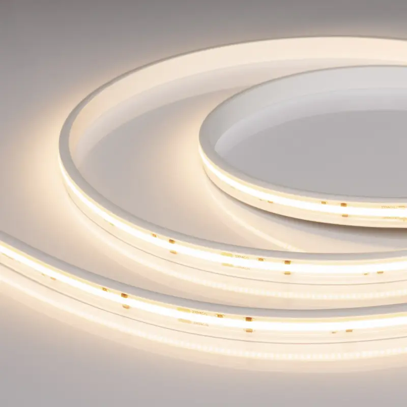 Светодиодная герметичная лента ARL сплошного свечения серии X720 со степенью защиты IP65, защитная оболочка из ПВХ устойчива к УФ излучению, что позволяет использовать ее на улице. Высокая плотность светодиодов X720 позволяет создать эффект сплошной идеальной линии света без применения рассеивающих экранов. Лента подключается непосредственно к сети переменного тока 230 В и не требует использования источников питания. Наличие интегральных стабилизаторов тока позволяет подключать ленту длиной до 30 м, обеспечивая при этом равномерную яркость свечения по всей длине ленты. При подключении нескольких лент необходимо подавать питание на каждые 30 м отдельным кабелем, последовательное подключение лент более 30 м запрещается. Лента применяется для подсветки потолочных ниш, декоративной подсветки, создания контуров рекламных объектов, может использоваться в помещениях и на улице. На лентах установлены микросхемы с функцией снижения тока для защиты ленты от перегрева, обеспечивающие надежную работу в различных условиях. Диммирование осуществляется диммерами TRIAC в диапазоне 30%-90%. Крепление с помощью скоб, аксессуары для монтажа и подключения поставляются отдельно.