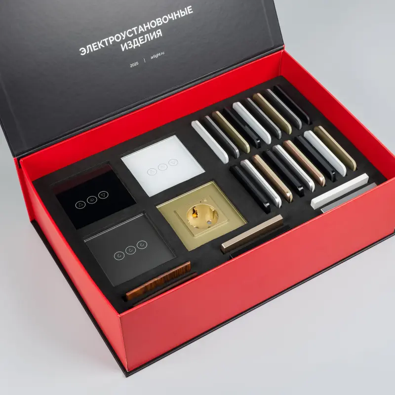 Демо-кейс с наполнением электроустановочных изделий серий AKIRY, PERIO, OMALI, XSILO и готовые решения серии умных устройств OMALI.