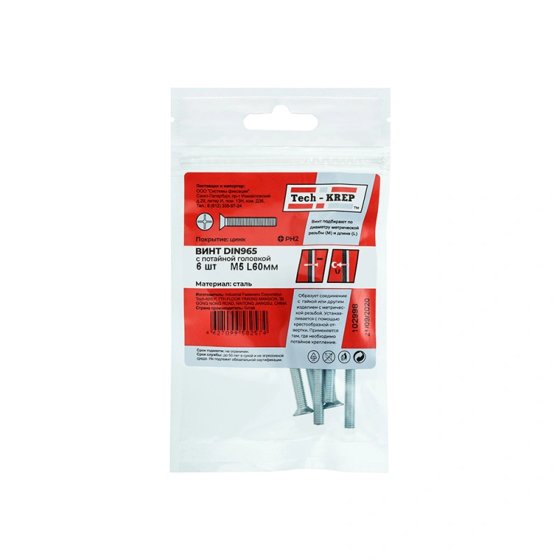 Винт DIN965 с потайной головкой оцинк. М5х60 (6 шт) - пакет Tech-Krep
