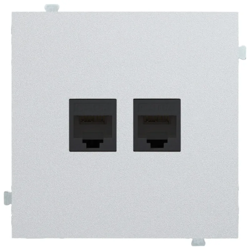 Розетка компьютерная двойная состоит из трех компонентов — суппорта для информационной розетки, лицевой панели для информационной розетки и пары модулей RJ45 кат. 5e. Суппорт розетки устанавливается в стандартный подрозетник с установочным диаметром 60 мм. Для окончательной сборки изделия необходимо добавить рамку с необходимым количеством постов.