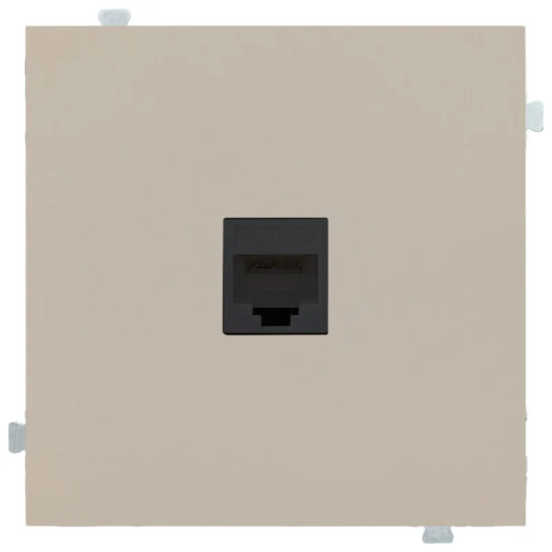 Розетка компьютерная одиночная состоит из трех компонентов — суппорта для информационной розетки, лицевой панели для информационной розетки и модуля RJ45 кат. 5e. Суппорт розетки устанавливается в стандартный подрозетник с установочным диаметром 60 мм. Для окончательной сборки изделия необходимо добавить рамку с необходимым количеством постов.