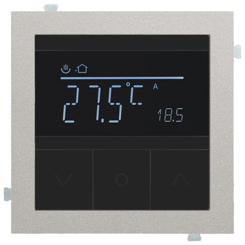 Термостат для теплого пола состоит из трех компонентов — механизма, адаптера выбранного цвета и датчика теплого пола. Механизм термостата устанавливается в стандартный подрозетник с установочным диаметром 60 мм. Для окончательной сборки изделия необходимо добавить рамку с необходимым количеством постов.