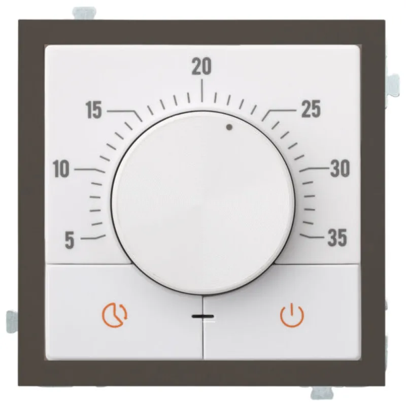 Термостат для теплого пола состоит из трех компонентов — механизма белого цвета, адаптера выбранного цвета и датчика теплого пола. Механизм термостата устанавливается в стандартный подрозетник с установочным диаметром 60 мм. Для окончательной сборки изделия необходимо добавить рамку с необходимым количеством постов.