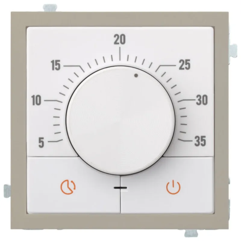 Термостат для теплого пола состоит из трех компонентов — механизма белого цвета, адаптера выбранного цвета и датчика теплого пола. Механизм термостата устанавливается в стандартный подрозетник с установочным диаметром 60 мм. Для окончательной сборки изделия необходимо добавить рамку с необходимым количеством постов.