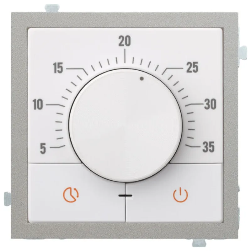 Термостат для теплого пола состоит из трех компонентов — механизма белого цвета, адаптера выбранного цвета и датчика теплого пола. Механизм термостата устанавливается в стандартный подрозетник с установочным диаметром 60 мм. Для окончательной сборки изделия необходимо добавить рамку с необходимым количеством постов.