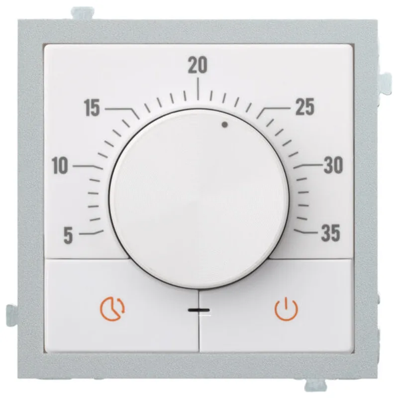 Термостат для теплого пола состоит из трех компонентов — механизма белого цвета, адаптера выбранного цвета и датчика теплого пола. Механизм термостата устанавливается в стандартный подрозетник с установочным диаметром 60 мм. Для окончательной сборки изделия необходимо добавить рамку с необходимым количеством постов.