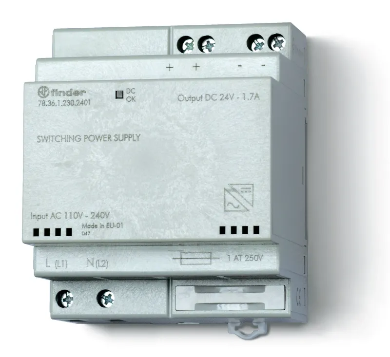 Finder Импульсный источник питания; вход 110...240В AC; выход 24В DC, 36Вт; модульный, ширина 70мм; предохранитель входой цепи; степень защиты IP20