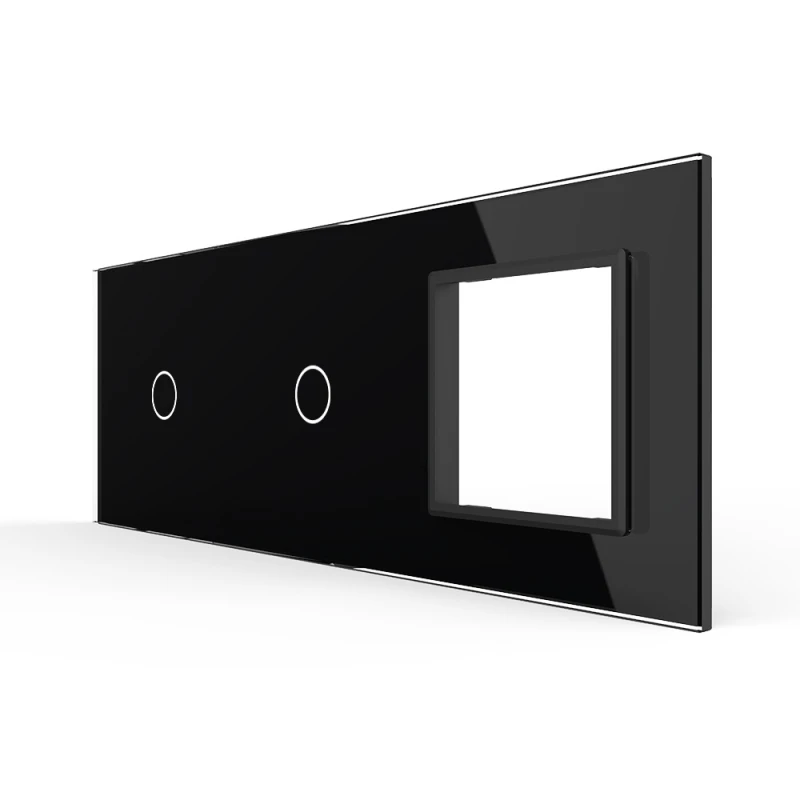 Панель комбинированная на три поста для двух сенсорных одноклавишных выключателей одну розетку LIVOLO черного цвета используется для установки на механизмы силовых розеток, клавишных выключателей, слаботочных и мультимедийных розеток, датчиков, подсветок, терморегуляторов, сенсорных выключателей серии Classic, Quadro и Module.