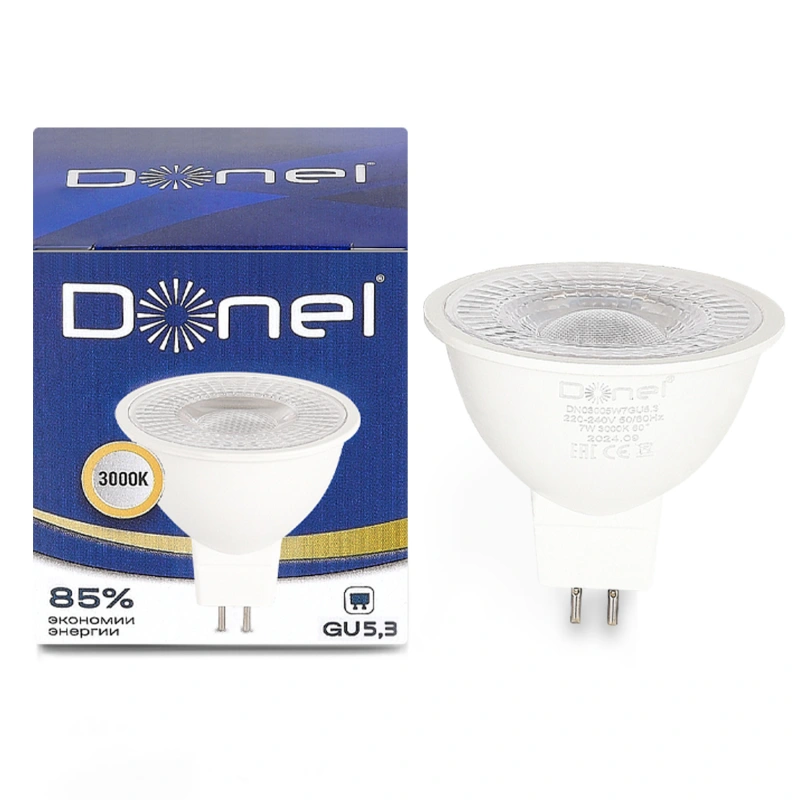 Donel, Светодиодная лампа 7Вт, MR16, 220В, GU5,3, 3000K, 525Лм, Ra>80, 60°, D50хH50мм, Серия: DN03