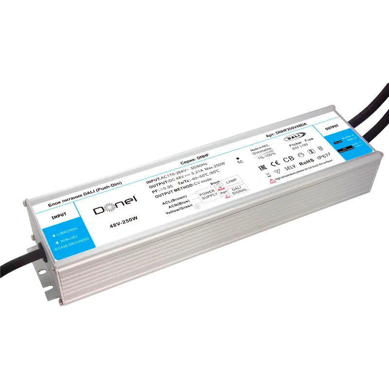 Donel блок питания DALI 250Вт, DC48В, 5.2А, IP67, 260*73*45мм, с функцией Push-Dim, PFC >0.95, PWM=16KHZ серия:DN8HF