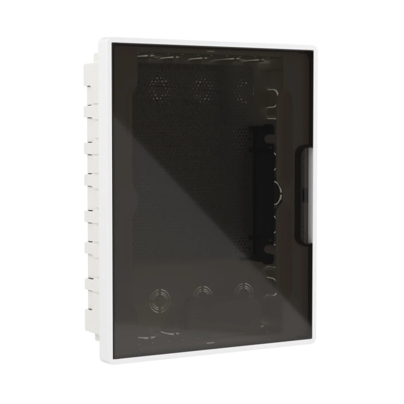 Щиток 24 мод встраиваемый слаботочный FRAME, белый, с тонированной дверцей, с монтажной платой, в комплекте с 1 розеткой Viva (арт. 45005) и 1 коробкой PDD (арт. 10033)