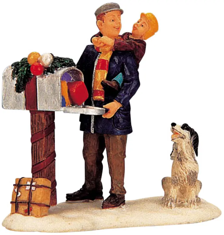 Рождественское утро несет с собой радость, веселье и подарки не только для детей, но и для взрослых. Подарки под елкой уже разобраны. Пора проверить украшенный к празднику почтовый ящик — соседи и друзья из дальних городов прислали свои поздравления. Папа в синей куртке, серой кепочке и нарядном полосатом шарфе посадил к себе на спину своего нетерпеливого сына и они вместе отправились на улицу. Услышав щелчок при открывании ящика, четвероногий друг семьи тоже примчался со двора, чтобы посмотреть, что же за подарки прислали им. Может там есть для него вкусная косточка?