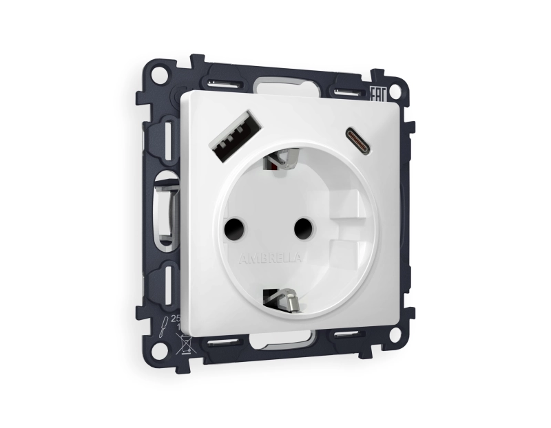 Комплект механизма электрической розетки ALFA MA130010 Белый матовый 2USB A+C 20W (быстрая зарядка) с заземлением со шторками (AP1300, VM160)