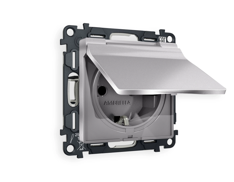 Комплект механизма электрической розетки ALFA MA508010 Сталь матовый 16A-250V 50Hz 2P+E с заземлением, шторками и защитной крышкой IP44 QUANT (AP5080, VM141)