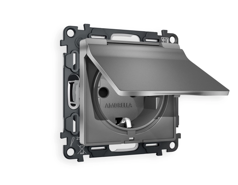 Комплект механизма электрической розетки ALFA MA658010 Антрацит серый 16A-250V 50Hz 2P+E с заземлением, шторками и защитной крышкой IP44 QUANT (AP6580, VM141)