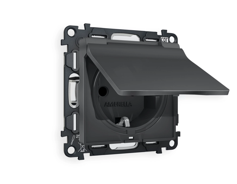 Комплект механизма электрической розетки ALFA MA908010 Графит мягкое касание 16A-250V 50Hz 2P+E с заземлением, шторками и защитной крышкой IP44 QUANT (AP9080, VM141)