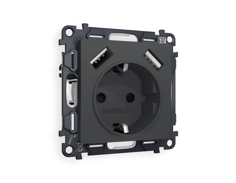 Комплект механизма электрической розетки ALFA MA909010 Графит мягкое касание 2USB A+A 18W 3000mA (быстрая зарядка) 180-220V/50Hz (5V3A, 9V2.22A, 12V1.66A) с заземлением со шторками 16A-250V 50Hz 2P+E QUANT (AP9090, VM155)