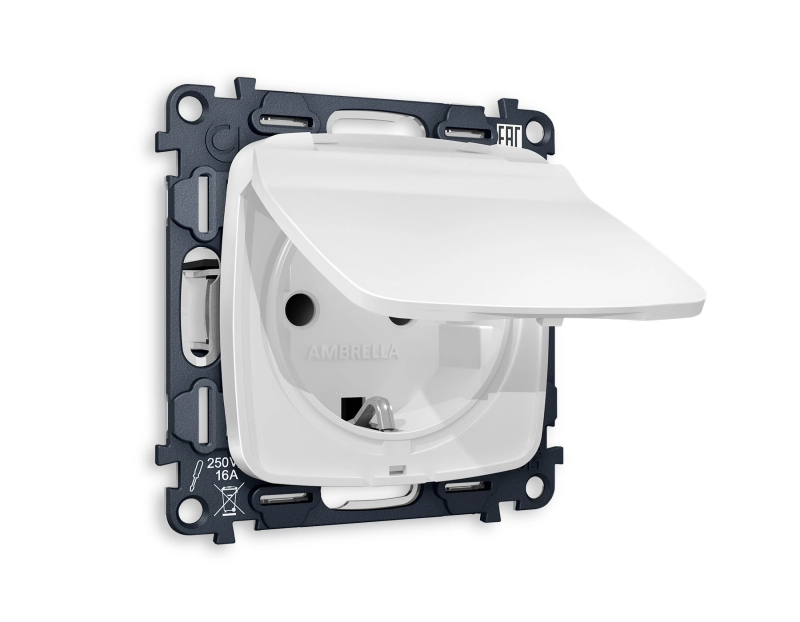 Комплект механизма электрической розетки OMEGA MO128010 Белый матовый 16A-250V 50Hz 2P+E с заземлением со шторками и защитной крышкой IP44 QUANT (OP1280, VM141)