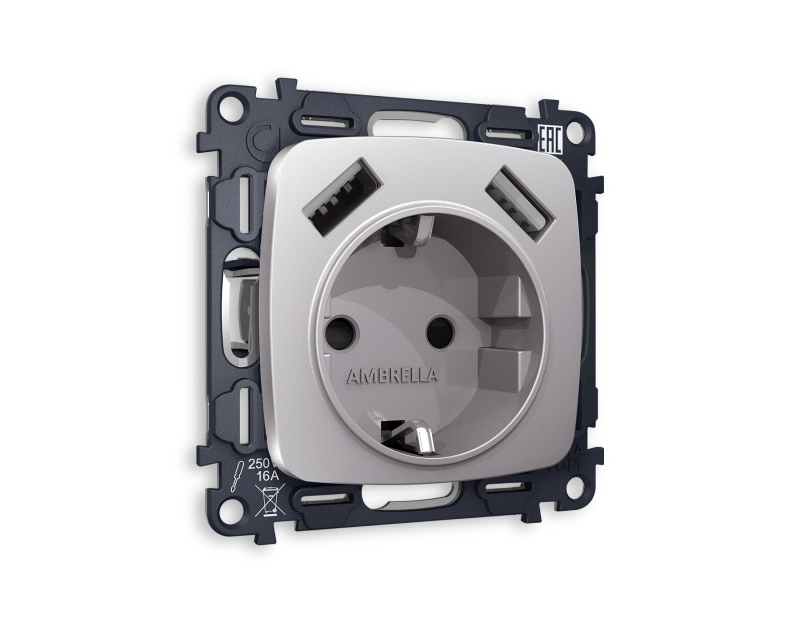 Комплект механизма электрической розетки OMEGA MO509010 Сталь матовый 2USB A+A 18W 3000mA (быстрая зарядка) 180-220V/50Hz (5V3A, 9V2A, 12V1.5A) с заземлением со шторками 16A-250V 50Hz 2P+E QUANT (OP5090, VM155)