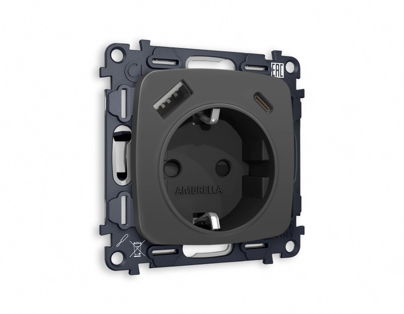 Комплект механизма электрической розетки OMEGA MO910010 Графит мягкое касание 2USB A+C 20W 3000mA (быстрая зарядка) 180-220V/50Hz (5V3A, 9V2.22A, 12V1.66A) с заземлением с шторками 16A-250V 50Hz 2P+E QUANT (OP9100, VM160)