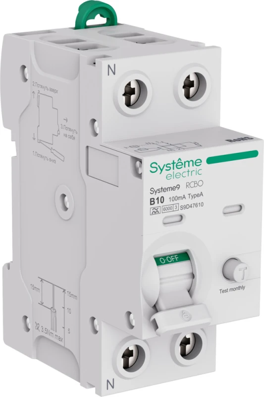 Автоматический выключатель дифференциального тока (АВДТ) S9D, серии Systeme9, Systeme Electric, 1P+N, номинальный ток 10 А, характеристика B, Icn = 6 кА, ток утечки = 100 мА, тип A. Соответствует требованиям стандартов ГОСТ IEC 61009-1 и ГОСТ IEC 60947-2. Применяется в электрических сетях напряжением 230 В. Предназначен для защиты цепей от сверхтоков и для защиты людей от токов утечки при прямом (10 и 30мА) и косвенном (100мА) прикосновении к токоведущим частям, а также для защиты электроустановок от возгорания (300мА). Принцип действия - электромеханический. Нейтраль слева. Оснащен двойными безопасными клеммами раздельного монтажа проводников, механизмом мгновенной коммутации, индикатором состояния контактной группы и раздельными индикаторами срабатывания по причине возникновения сверхтока или тока утечки. Монтируется на DIN-рейку при помощи двухпозиционных защёлок, с возможностью демонтажа без снятия шины PIN.